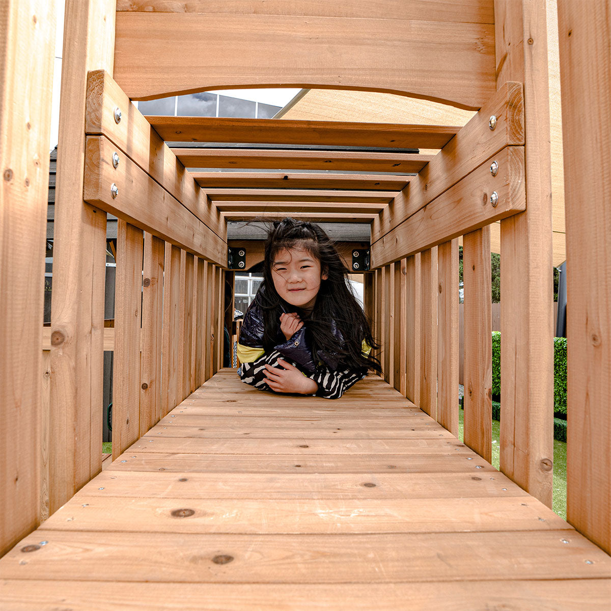 Beneath the playhouse, the hideaway zone features a picnic bench and snack window, creating a cozy retreat for kids to relax and play. Perfect for imaginative pretend meals or quiet moments, this sheltered nook adds charm and versatility to the play centre experience.