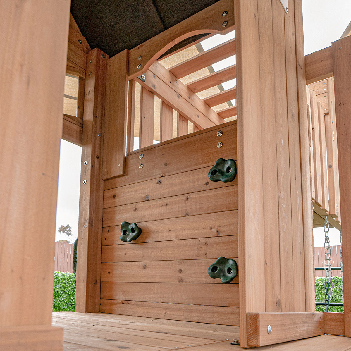 The Kensington Play Centre is reinforced with high-strength steel brackets, powder-coated for superior weather protection. These heavy-duty fittings ensure stability, safety, and long-term durability, keeping the playset secure through years of active outdoor play.