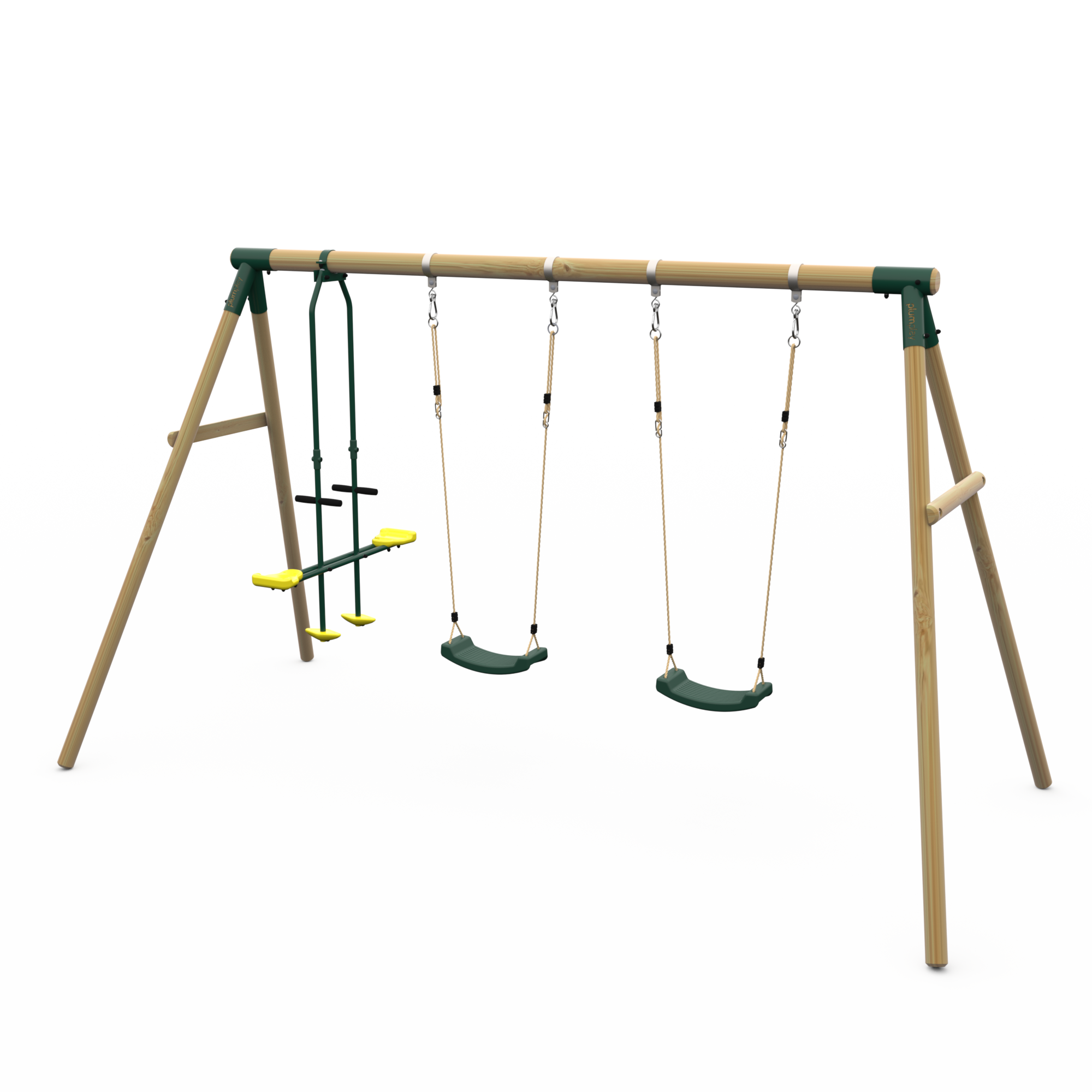 This wooden swing set from Plum® offers a 2 seat glider and double swings, which use soft feel ropes and heavy duty blow moulded seats for extra durability.