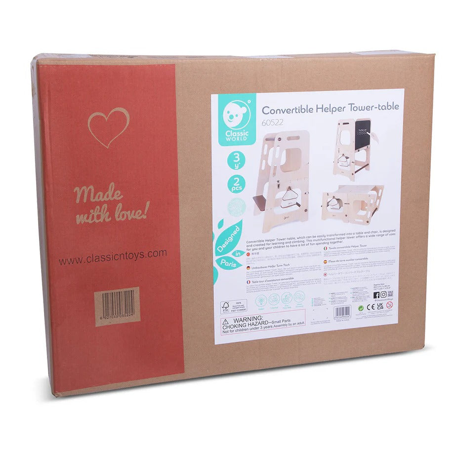Say hello to the Classic World Convertible Helper Tower-Table — the ultimate sidekick for curious little learners! This clever design transforms from a step-up helper tower into a functional table and chair, making it perfect for cooking, crafting, learning, or snacking.