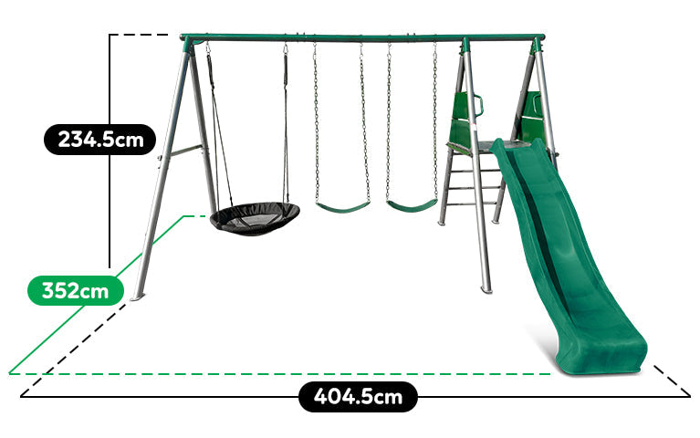 Max Weight Capacity: 150kg per belt swing, 200kg on nest swing, 50kg on slide