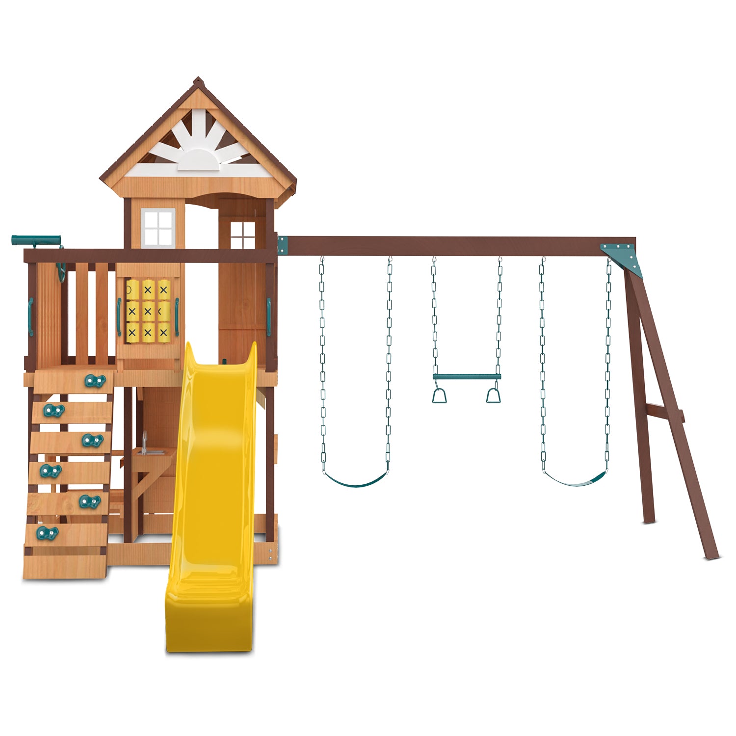 The Coventry Play Centre features a 3-position swing beam with two classic swings and a trapeze bar for endless outdoor excitement. Kids can swing high through the air or try fun acrobatics on the trapeze, building upper body strength, balance, and coordination while enjoying hours of active play.