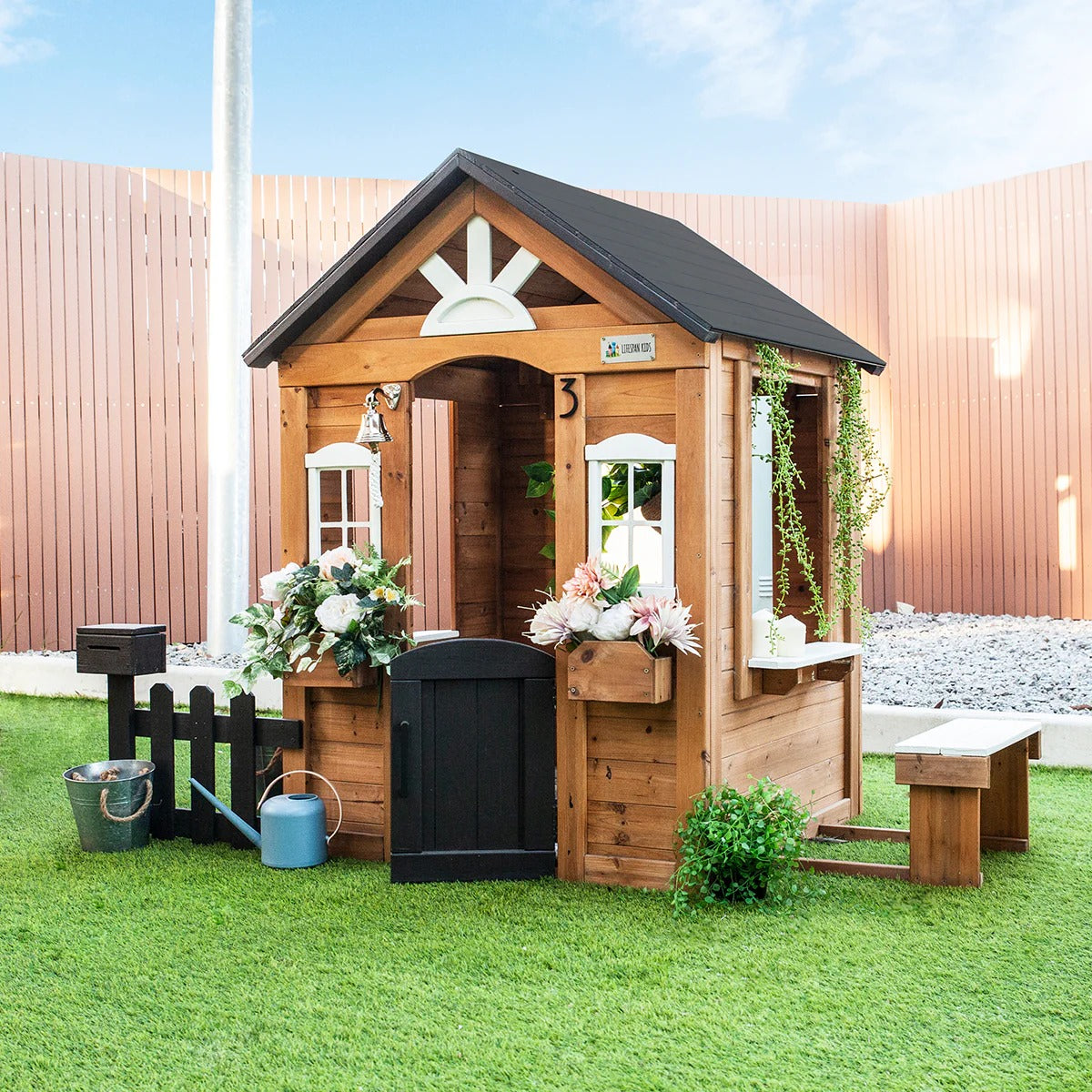 Decorated with quaint features like windows, flower planters, picket fence, and a mail box to provide endless fun for your little one.